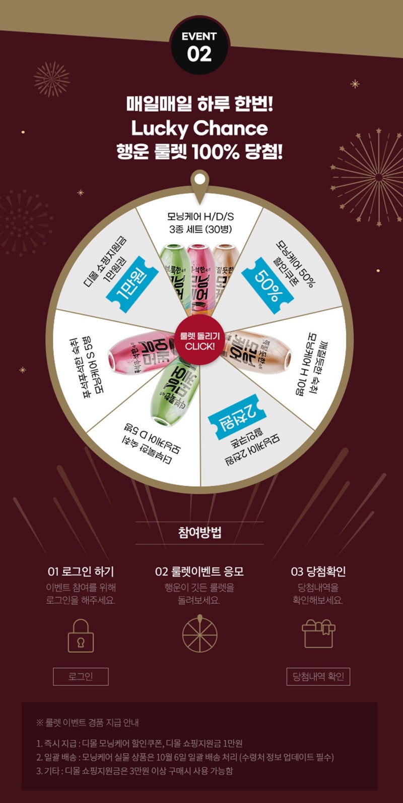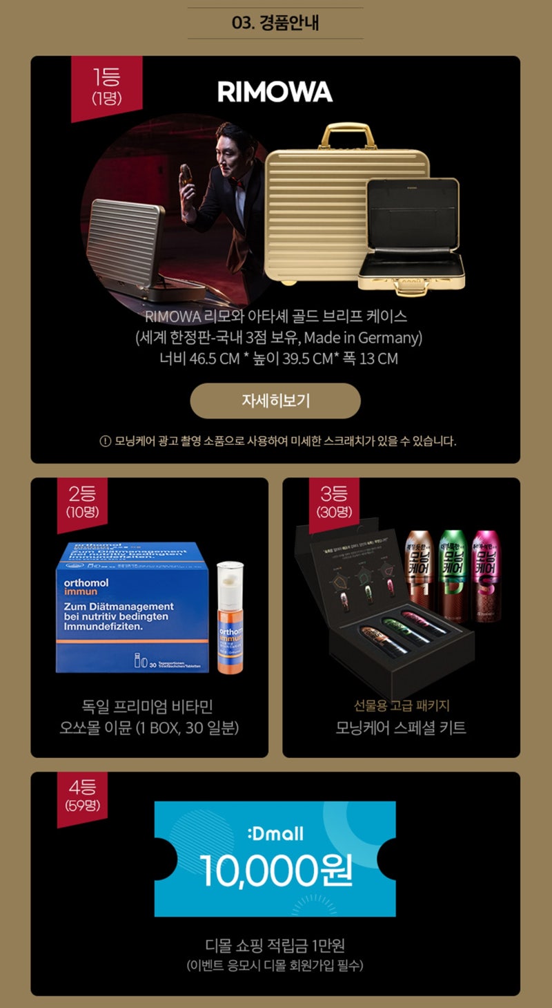 플라스틱 커버가 있는데 위아래를 잡고 열면 점선을 따라 깔끔하게 열 수 있습니다. 모닝케어D가 다음날 부들부들하지 않을까 걱정하던 마나님은 모닝케어S를 준비하고 떠돌이 가족 술자리를 즐겼다. 모닝 케어 이벤트도 대박! 여러분께 소개하고 싶습니다. 이번 리셉션을 통해 모닝케어 이벤트에 참여하게 된 계기는 ‘무조건 출석하고 당첨되세요’라는 문구가 눈에 띄었기 때문이다. 우선 구매 인증샷을 올리면 전 세계 한정판인 명품 리모와 골드 브리프케이스는 국내 단 3개라고 합니다. 특히 이번에 모닝케어 CF에서 모델이 사용했을 때 더욱 눈길을 끈다. 이와 더불어 온라인 구매가 가능한 디몰 크레딧에 프리미엄 비타민과 리뉴얼된 모닝 트리트먼트를 제공하는 캠페인도 진행 중이다. 구매한 모닝케어 제품을 샘플, 라벨과 함께 인스타그램에 올려 참여해보세요. 리미티드 에디션의 주인공이 될 수 있기를 바라며 집에서 몇 잔 더 마실까도 생각했습니다. 참가자 전원이 당첨되는 룰렛 이벤트입니다. 온라인에서 동아제약 제품을 판매하는 디몰에 로그인하고 룰렛을 플레이하면 손쉽게 이벤트에 참여하실 수 있습니다. 회원가입 및 로그인 후 룰렛만 돌리면 모닝케어키트 3종이 당첨되어 잠시나마 아침 숙취가 멈춥니다.