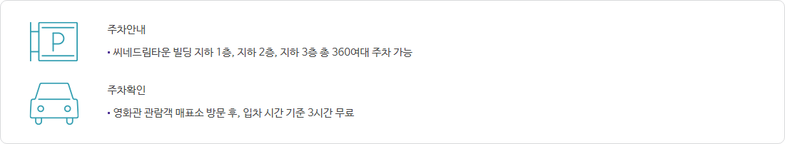 - 씨네드림 타운 빌딩 지하 1층, 지하 2층, 지하 3층에 총 360대의 주차 공간이 마련되어 있습니다.