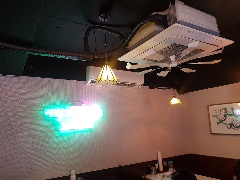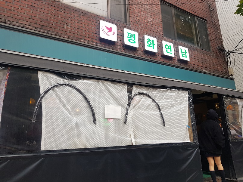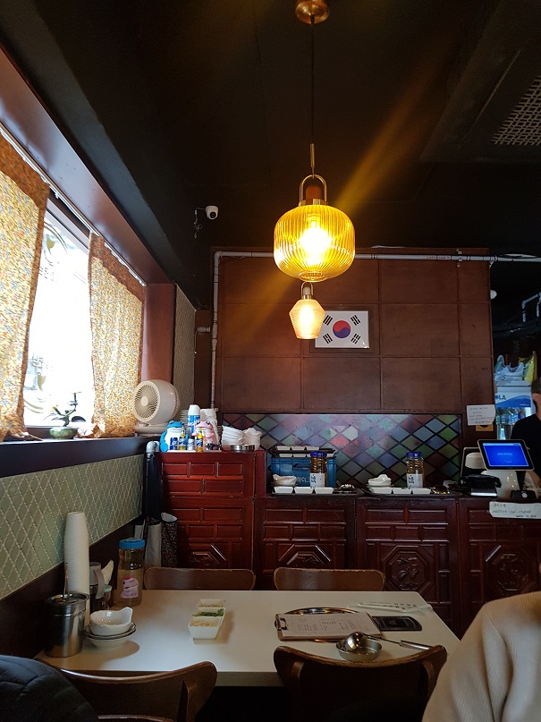 고풍스러움이 가미된 레트로 스타일. 특히 태극기가 붙어 있다. 평화식당이라는 이름과 관련이 있나요?