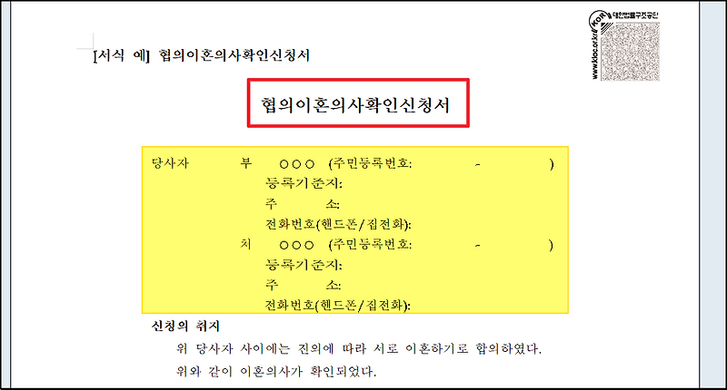 서로 협의하에 이혼을 진행하기로 했다면 협의 이혼 의사 확인 신청서를 작성해야 합니다. 제 생각에는 가장 많이 사용되는 이혼 서류 중 하나로 판단됩니다. 서로에 대한 정보를 기재한 후 몇 가지 서류를 첨부하여 법원에 제출하면 됩니다. 아래 첨부된 파일을 인쇄하여 사용할 수도 있으며 가까운 가정법원에 방문하여 양식을 수령할 수도 있습니다. 첨부 파일 신청서 양식.hwp 파일 다운로드 내 컴퓨터 저장