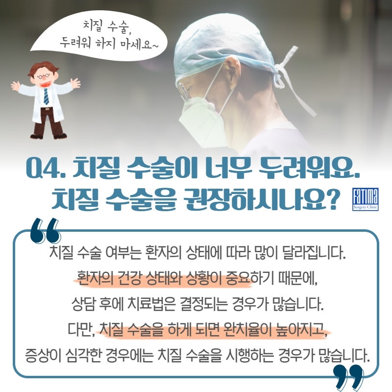 안녕하세요 반차오에서 치질을 치료하는 파티마성형외과입니다. 치질은 치질 환자에게 가장 흔한 유형의 치질 중 하나입니다. 치질에는 치질, 열창, 누공 등이 있으나 연령과 성별에 관계없이 발생률이 가장 높습니다. 치질은 치료하지 않거나 치료하지 않고 방치하면 심한 통증을 유발할 수 있습니다. 치질의 치료는 약물치료와 외과적 치료로 나눌 수 있습니다. 그렇다면 치질 수술은 언제 필요할까요?