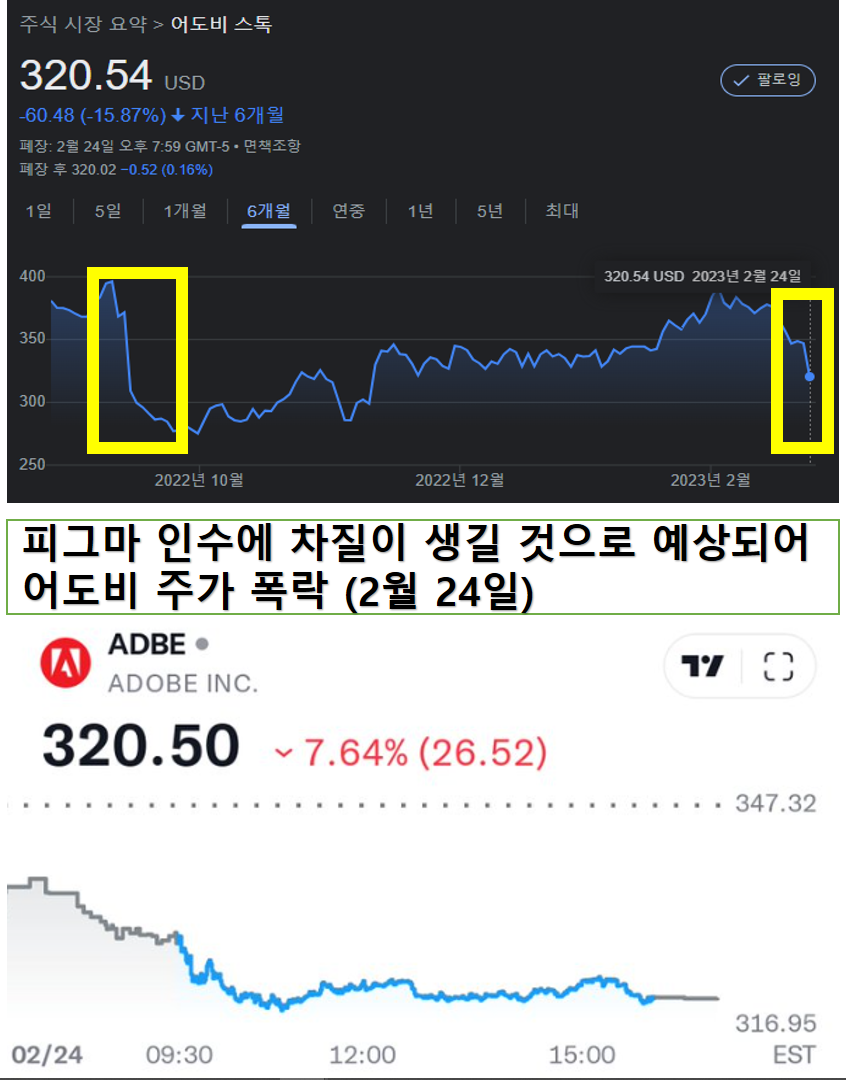 Adobe가 작년에 Figma 인수를 발표했을 때 엄청난 주가 하락을 보였습니다. 그래서 Figma 인수가 취소될 수 있다는 기사를 읽었을 때 투자자들이 걱정하는 금액을 지출할 필요가 없기 때문에 Adobe 주식이 조금 오를까 하는 생각이 들었습니다. 하지만 시장 반응은 생각과 달랐다. 시장은 어도비의 피그마 인수 실패를 어도비의 더 큰 악재로 받아들이고 주가는 다시 폭락했다.할 것이다. 사후적으로 시장의 반응을 분석해보면 피그마를 거액에 인수하는 것은 나쁜 일인 것 같지만 그래도 인수하는 것이 바람직하다.